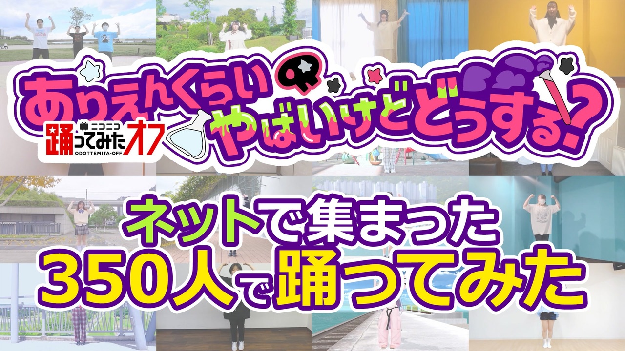 ニコニコ超会議「超踊ってみた」ブースで恒例の大人気企画『踊オフ』!<br>日本全国はもちろん、海外やバーチャルからもご参加いただき<br>ネットに集まった350人で、踊ってみた動画を作りました!<br><br><span style="font-size: 24px;">踊ってみたが大好きすぎてやばいけどどうする?</span><br><br>====================<br><br>楽曲:ありえんくらいやばいけどどうする? <a href="https://www.nicovideo.jp/watch/sm41192259" class="watch">sm41192259</a><br>作詞作曲:タケノコ少年 <a href="https://twitter.com/TA_MOR_I" target="_blank" rel="noopener nofollow">https://twitter.com/TA_MOR_I</a><br><br>====================<br><br><span style="font-size: 16px;"><strong>▼踊オフ2023 関連動画</strong></span><br><br>振り付け動画 <a href="https://www.nicovideo.jp/watch/so42031715" class="watch">so42031715</a><br><br>幕張に集まったみんなで踊ってみたver <a href="https://www.nicovideo.jp/watch/so42241388" class="watch">so42241388</a><br><br>超踊ってみたコマ撮りver <a href="https://www.nicovideo.jp/watch/so42203529" class="watch">so42203529</a><br><br>====================<br><br>■踊ってみた公式Twitter<br><a href="https://twitter.com/odottemita_PR" target="_blank" rel="noopener nofollow">https://twitter.com/odottemita_PR</a><br><br>====================<br><br>◇ニコニコ超会議2023 開催概要◇<br>開催日時:2023年4月22日(土)〜4月30日(日)<br>ニコニコ超会議公式サイト:<a href="https://chokaigi.jp/" target="_blank" rel="noopener nofollow">https://chokaigi.jp/</a><br>ニコニコ超会議公式Twitter:<a href="https://twitter.com/chokaigi_pr" target="_blank" rel="noopener nofollow">https://twitter.com/chokaigi_pr</a>