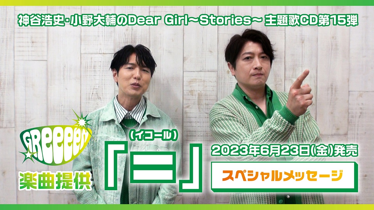 文化放送&ラジオ大阪で放送中のラジオ番組「神谷浩史・小野大輔のDear Girl~Stories~」の15th番組主題歌CD「=」が2023年6月23日(金)にアニメイト、文化放送A&Gショップにて発売決定!現在、予約受付中!<br><br>CDには2023年4月からオンエア中の新オープニングテーマ「=」(イコール)と新エンディングテーマ「U&ME」、各オフボーカルバージョン、シングル恒例おまけトラックとして番組から生まれたエアバンドMASOCHISTIC ONO BANDがデビュー10周年を迎えるにあたって作られた「Dangerous Groove 10th」とドキュメント「MASOCHISTIC ONO BAND 10th 緊急招集」を収録!<br><br>アニメイト、A&Gショップそれぞれ購入特典がありますが、<br>購入特典は数に限りがありますのでご予約はお早めに!<br><br><br>CD収録楽曲:<br>01.=<br>作詞・作曲:GReeeeN 編曲:KOUICHI<br>02.U&ME<br>作詞・作曲:GReeeeN 編曲:山本匠・SHUN<br>03.=(off vocal)<br>04.U&ME(off vocal)<br>05.ドキュメント「MASOCHISTIC ONO BAND 10th 緊急招集」<br>06.Dangerous Groove 10th<br>作詞:古屋真 作曲:三宅博文<br><br>[ 商品情報 ]<br>発売日:2023年6月23日(金)予定<br>価格:1,650円(税込)<br><br>[ 取扱い]<br>・アニメイト店頭、アニメイトオンライン<br>・文化放送インターネット通販サイト:A&Gショップ<br><br><br>[ 購入特典 ]<br>アニメイト特典:B2ポスター<br><a href="https://bit.ly/3LGDI4w" target="_blank" rel="noopener nofollow">https://bit.ly/3LGDI4w</a><br><br>文化放送A&Gショップ 特典:L判ブロマイド<br><a href="https://aandg.shop-pro.jp/?pid=173983115" target="_blank" rel="noopener nofollow">https://aandg.shop-pro.jp/?pid=173983115</a><br><br><br><br>「神谷浩史・小野大輔のDear Girl~Stories~」(DGS)のニコニコチャンネル「DGSチャンネル」も更新中です。<br><a href="https://ch.nicovideo.jp/dgs" target="_blank" rel="noopener nofollow">https://ch.nicovideo.jp/dgs</a><br><br>月額550円(税込)の有料会員制で、チャンネル会員向けに、録り下ろしの音声コンテンツ「裏談話室」や過去の放送を再編集したディレクターズカット版、動画コンテンツ、ブロマガ等を配信しています。是非チャンネル登録よろしくお願いします。<br><br><br>番組では皆さんからのお便りお待ちしています。<br><br>・放送日時<br>文化放送 毎週(土)25時〜25時30分<br>ラジオ大阪 毎週(日)23時〜23時30分<br>インターネットサイマルラジオradikoでも聴取可能です。<br><br>・公式Twitter<br><a href="https://twitter.com/uchi_P_" target="_blank" rel="noopener nofollow">https://twitter.com/uchi_P_</a><br><br>・番組メールアドレス<br>dgs@joqr.net<br><br>・番組公式サイト<br><a href="https://pc.animelo.jp/special/deargir..." target="_blank" rel="noopener nofollow">https://pc.animelo.jp/special/deargir...</a>