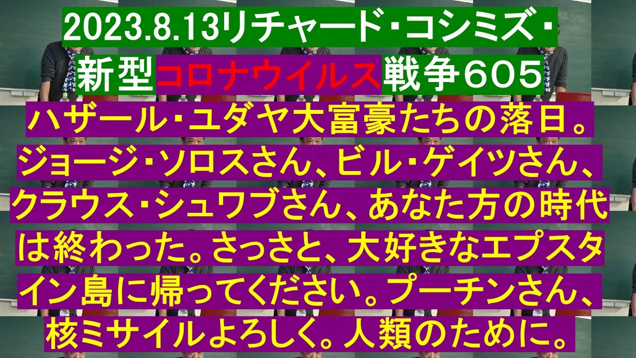 2023.8.13リチャード・コシミズ・新型コロナウイルス戦争605<br>ハザール・ユダヤ大富豪たちの落日。<br>ジョージ・ソロスさん、ビル・ゲイツさん、クラウス・シュワブさん、あなた方の時代は終わった。さっさと、大好きなエプスタイン島に帰ってください。プーチンさん、<br>核ミサイルよろしく。人類のために。<br>