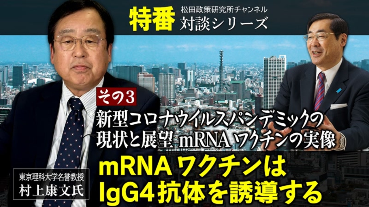 特番『新型コロナウイルスパンデミックの現状と展望mRNAワクチンの実像』その3<br>ーmRNAワクチンはIgG4抗体を誘導するー<br><br>ゲスト:東京理科大学名誉教授 村上康文氏<br>司会:松田政策研究所 代表 松田学<br><br><YouTubeチャンネル登録お願いいたします><br><a href="http://www.youtube.com/channel/UCAN0E..." target="_blank" rel="noopener nofollow">http://www.youtube.com/channel/UCAN0E...</a><br><YouTubeセカンドチャンネルはこちら><br><a href="https://www.youtube.com/channel/UCUdA..." target="_blank" rel="noopener nofollow">https://www.youtube.com/channel/UCUdA...</a><br><松田政策研究所 ニコニコチャンネル 一部有料 月額550円><br><a href="https://ch.nicovideo.jp/matsuda-pi" target="_blank" rel="noopener nofollow">https://ch.nicovideo.jp/matsuda-pi</a><br><br>松田学公式ホームページ<br><a href="https://matsuda-manabu.jp/" target="_blank" rel="noopener nofollow">https://matsuda-manabu.jp/</a><br><br>松田政策研究所FB<br><a href="https://www.facebook.com/matsudaseisaku/" target="_blank" rel="noopener nofollow">https://www.facebook.com/matsudaseisaku/</a><br><br>無料メルマガはこちら*バックナンバーあり<br><a href="http://matsuda-manabu.jp/e-zine/" target="_blank" rel="noopener nofollow">http://matsuda-manabu.jp/e-zine/</a>