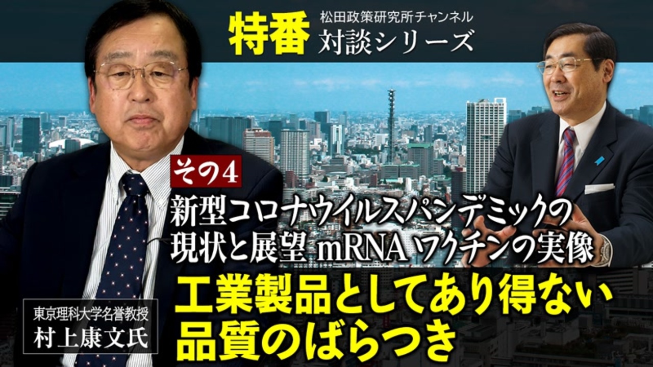 特番『新型コロナウイルスパンデミックの現状と展望mRNAワクチンの実像』その4<br>ー工業製品としてあり得ない品質のばらつきー<br><br>ゲスト:東京理科大学名誉教授 村上康文氏<br>司会:松田政策研究所 代表 松田学<br><br><YouTubeチャンネル登録お願いいたします><br><a href="http://www.youtube.com/channel/UCAN0E..." target="_blank" rel="noopener nofollow">http://www.youtube.com/channel/UCAN0E...</a><br><YouTubeセカンドチャンネルはこちら><br><a href="https://www.youtube.com/channel/UCUdA..." target="_blank" rel="noopener nofollow">https://www.youtube.com/channel/UCUdA...</a><br><松田政策研究所 ニコニコチャンネル 一部有料 月額550円><br><a href="https://ch.nicovideo.jp/matsuda-pi" target="_blank" rel="noopener nofollow">https://ch.nicovideo.jp/matsuda-pi</a><br><br>松田学公式ホームページ<br><a href="https://matsuda-manabu.jp/" target="_blank" rel="noopener nofollow">https://matsuda-manabu.jp/</a><br><br>松田政策研究所FB<br><a href="https://www.facebook.com/matsudaseisaku/" target="_blank" rel="noopener nofollow">https://www.facebook.com/matsudaseisaku/</a><br><br>無料メルマガはこちら*バックナンバーあり<br><a href="http://matsuda-manabu.jp/e-zine/" target="_blank" rel="noopener nofollow">http://matsuda-manabu.jp/e-zine/</a>