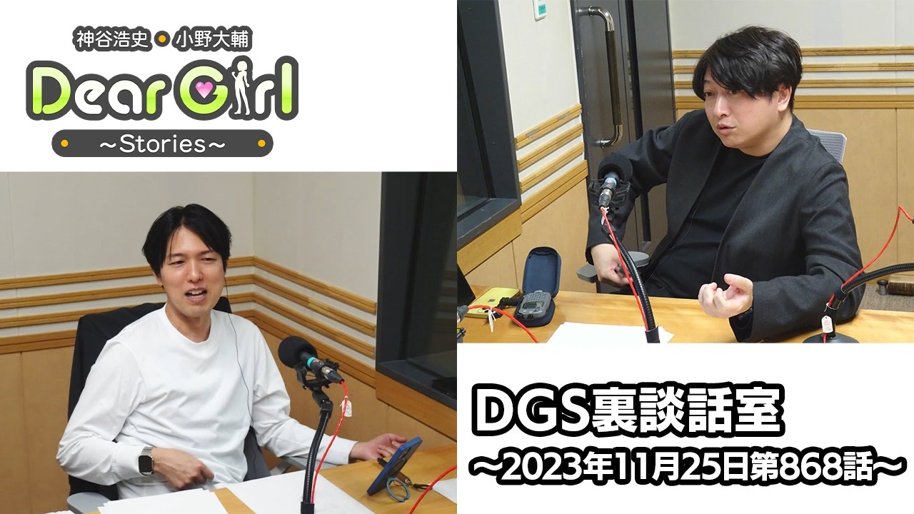 『神谷浩史・小野大輔のDear Girl〜Stories〜』<br>声優・神谷浩史、小野大輔がストーリーテラーとなってラジオの前のたった一人のアナタのために様々なストーリーをお届けするラジオプログラム。<br><br>こちらではDGS本編には収録されていない裏の談話室をお届けします。<br><br>----------<br><br>「Dear Girl〜Stories〜Festival Carnival 15年祭」を収録したBlu-ray&DVDが2023年11月30日発売決定!<br>横浜公演2日目の模様を完全収録!特典映像には、神戸公演両日、横浜公演初日のMASOCHISTIC ONO BAND (MOB)出演パートの日替わり楽曲コーナー(「Merry XXXmas」「Punishment is Reward」「Sweeeet!!」)とメジャーデビュー記者会見の模様を収録!<br>音声特典にはオーディオコメンタリーも!<br><br>▼ご予約はこちら<br>【Blu-ray】<br><a href="https://aandg.shop-pro.jp/?pid=177132372" target="_blank" rel="noopener nofollow">https://aandg.shop-pro.jp/?pid=177132372</a><br>【DVD】<br><a href="https://aandg.shop-pro.jp/?pid=177131752" target="_blank" rel="noopener nofollow">https://aandg.shop-pro.jp/?pid=177131752</a><br><br>----------<br><br>文化放送&ラジオ大阪で放送中のラジオ番組「神谷浩史・小野大輔のDear Girl~Stories~」の第15弾主題歌は、GReeeeNとコラボしてお届け!番組主題歌CD「=」がアニメイト、文化放送A&Gショップにて発売中!<br><br>▼ご購入はこちら <br>アニメイト(特典:B2ポスター)<br><a href="https://www.animate-onlineshop.jp/pn/pd/2242613/" target="_blank" rel="noopener nofollow">https://www.animate-onlineshop.jp/pn/pd/2242613/</a> <br><br>文化放送A&Gショップ (特典:L判ブロマイド)<br><a href="https://aandg.shop-pro.jp/?pid=173983115" target="_blank" rel="noopener nofollow">https://aandg.shop-pro.jp/?pid=173983115</a><br><br>----------<br><br><br>・放送日時<br>文化放送 毎週(土)25時〜25時30分<br>ラジオ大阪 毎週(日)23時〜23時30分<br>インターネットサイマルラジオradikoでも聴取可能です。<br><br>・公式Twitter<br><a href="https://twitter.com/uchi_P_" target="_blank" rel="noopener nofollow">https://twitter.com/uchi_P_</a><br><br>・番組メールアドレス<br>dgs@joqr.net<br><br>・番組公式サイト<br><a href="https://pc.animelo.jp/special/deargirl-stories/" target="_blank" rel="noopener nofollow">https://pc.animelo.jp/special/deargirl-stories/</a><br>