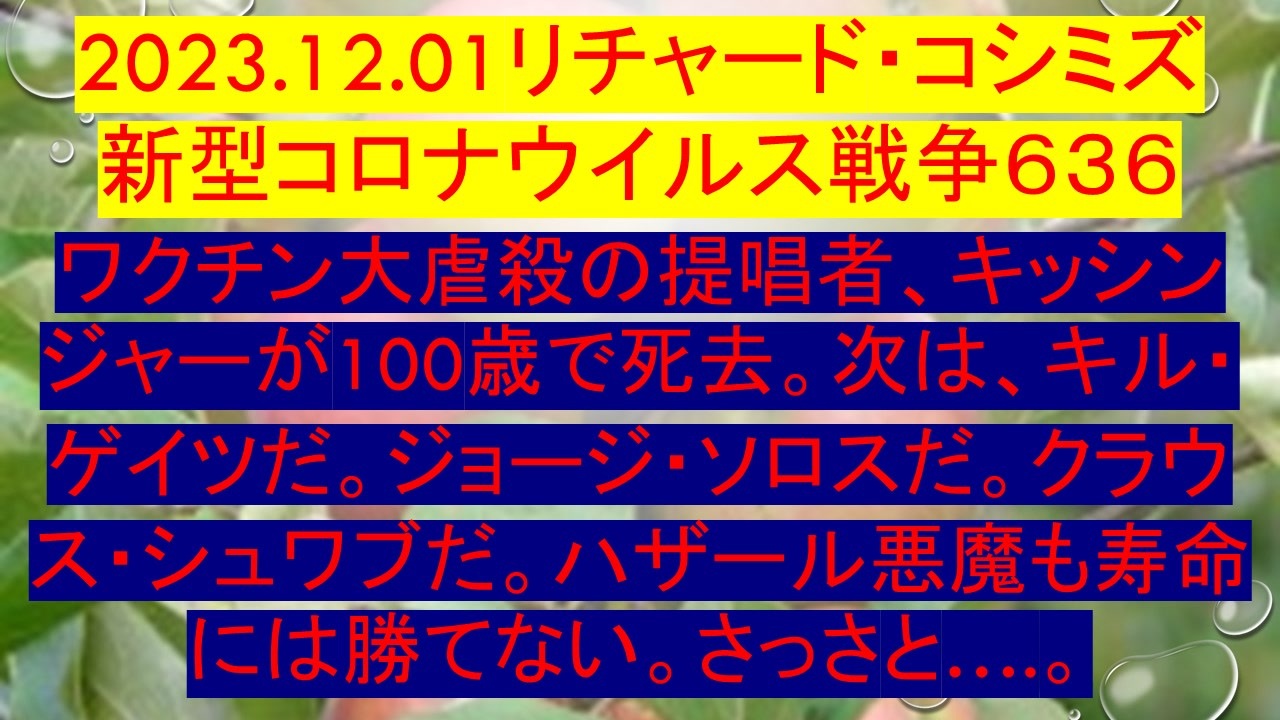 2023.12.01リチャード・コシミズ新型コロナウイルス戦争636<br>ワクチン大虐殺の提唱者、キッシンジャーが100歳で死去。次は、キル・ゲイツだ。ジョージ・ソロスだ。クラウス・シュワブだ。ハザール悪魔も寿命には勝てない。さっさと….。<br>
