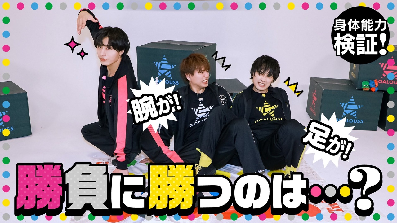 【GOALOUS5 ニコニコ動画支部】<br>ツイスターでイエローに悲劇が…!身体能力検証2023(第237回)<br><br>★4周年記念食事会&戦闘訓練の模様をたっぷり収めた「GOALOUS Training 2023」Blu-ray<br>ジークレストアにて発売中!<br><br>①数量限定ゴーラス盤<br>価格:13,000円(税込)<br>特典:撮り下ろしブロマイド3種、GOALOUS Training Tシャツ<br><a href="https://gcrest.store/collections/goalous5/products/gcp20230153g5" target="_blank" rel="noopener nofollow">https://gcrest.store/collections/goalous5/products/gcp20230153g5</a><br><br>②通常盤<br>価格:8,800円(税込)<br><a href="https://gcrest.store/collections/goalous5/products/gcp20230152g5" target="_blank" rel="noopener nofollow">https://gcrest.store/collections/goalous5/products/gcp20230152g5</a><br><br>※数量限定ゴーラス盤はなくなり次第終了となります。<br>※数量限定ゴーラス盤・通常盤のBlu-ray収録内容は共通です。<br><br>★MISSION:GO5 ボイスドラマVol.04「江戸ノ町ヲ声福セヨ!」発売中!<br>ボイスドラマと新規楽曲「伍色ノ華」も収録!<br><br>①CD販売店情報<br><GCRESTORE(ジークレストア)><br><a href="https://gcrest.store/products/gcp20230113g5" target="_blank" rel="noopener nofollow">https://gcrest.store/products/gcp20230113g5</a><br><アニメイト(通販含む)><br><a href="https://www.animate-onlineshop.jp/pn/pd/2281965/" target="_blank" rel="noopener nofollow">https://www.animate-onlineshop.jp/pn/pd/2281965/</a><br>購入者特典:<br>音声特典ボイスカード(全5種、ランダム)<br>収録内容:各キャラクターの江戸時代シチュエーションボイスを収録<br><br>②コンプリートセット(数量限定)<br>ジークレストアのみでの販売です<br><a href="https://gcrest.store/products/gcp20230114g5" target="_blank" rel="noopener nofollow">https://gcrest.store/products/gcp20230114g5</a><br>購入者特典:<br>音声特典ボイスカード(全5種セット)<br>収録内容:各キャラクターの江戸時代シチュエーションボイスを収録<br>ゴーラスアクリルブロック(MISSION:GO5 Vol.04Ver.)<br><br>※ボイスドラマ、音声特典の収録内容は共通です<br><br>和装姿のアクスタ、卓上のぼり、扇子&手ぬぐいなど、ボイスドラマ関連グッズも予約受付中!<br><a href="https://gcrest.store/collections/goalous5" target="_blank" rel="noopener nofollow">https://gcrest.store/collections/goalous5</a><br><br>★GOALOUS5「GOALOUS BEST」予約受付中!<br>①販売店情報<br><GCRESTORE(ジークレストア)><br><a href="https://gcrest.store/products/gcp20230093g5" target="_blank" rel="noopener nofollow">https://gcrest.store/products/gcp20230093g5</a><br><アニメイト(通販含む全店舗)><br><a href="https://www.animate-onlineshop.jp/pn/pd/2268223/" target="_blank" rel="noopener nofollow">https://www.animate-onlineshop.jp/pn/pd/2268223/</a><br>※店舗別購入特典もあります<br><br>②収録内容(CD +Blu-ray)<br>【CD収録曲】<br>1.GO5!GOALOUS5!<br>2.Let's GOALOUS5!!<br>3.5 AHEAD!<br>4.RosyBeat<br>5.MIRAGE SHOW<br>6.Dreaming Time<br>7.Get set, 5!<br>8.GOALOUS Festa<br>9.戦慄のGOALOUS5!!!!!<br><br>【Blu-ray収録内容】<br>1.戦慄のGOALOUS5!!!!! Music Video<br>2.Making<br><br>GCGC-0016/¥6,110(税込)¥5,555(税抜)<br><br>③店舗別購入特典<br>GCRESTORE(ジークレストア):複製直筆コメント入り2L判ブロマイド<br>アニメイトオンライン:L判ブロマイド<br>※特典はなくなり次第、終了となります。<br><br>★4周年記念グッズ発売中!<br><a href="https://gcrest.store/collections/goalous5" target="_blank" rel="noopener nofollow">https://gcrest.store/collections/goalous5</a><br><br>★GOALOUS5『声福大作戦〜祝★三周年!進めゴーラス!〜』『声福大作戦 ~LIVE & READING~』Blu-ray 発売中!<br><br>①販売店情報<br><GCRESTORE(ジークレストア)><br><a href="https://gcrest.store/collections/goalous5" target="_blank" rel="noopener nofollow">https://gcrest.store/collections/goalous5</a><br><アニメイト(通販含む)><br><a href="https://www.animate-onlineshop.jp/pn/pd/2232907/" target="_blank" rel="noopener nofollow">https://www.animate-onlineshop.jp/pn/pd/2232907/</a><br><br>②各商品情報とダイジェスト<br>『声福大作戦〜祝★三周年!進めゴーラス!〜』<br><a href="https://youtu.be/VDnDTccWKq8" target="_blank" rel="noopener nofollow">https://youtu.be/VDnDTccWKq8</a><br>『声福大作戦 ~LIVE & READING~』<br><a href="https://youtu.be/cwDNdGwUIqQ" target="_blank" rel="noopener nofollow">https://youtu.be/cwDNdGwUIqQ</a><br><br>③同時購入特典<br>『声福大作戦〜祝★三周年!進めゴーラス!〜』と『声福大作戦 ~LIVE & READING~』Blu-rayを同時購入でM∞CARD(悪のスペシャルトーク収録)をお渡しします!<br>オーコメ収録後のGOALOUS5の感想などトークを収録!(約18分)<br>※内容はジークレストア、アニメイト共通となります<br>※特典はなくなり次第終了となります<br><br> ★悪の相談募集中<br>下記のフォームに記入、投稿をお願いいたします。<br><a href="http://bit.ly/2Q3wMUh" target="_blank" rel="noopener nofollow">http://bit.ly/2Q3wMUh</a><br><br>★GOALOUS5(ゴーラスファイブ)とは<br>世界声福(征服)を目論む悪の組織が、先遣隊として声を生業にする熊谷健太郎、小松昌平、寺島惇太、仲村宗悟、深町寿成を派遣した。それが「GOALOUS5(ゴーラスファイブ)」だ。5人は声を武器に人々を虜にし、世界を声福(征服)していくための活動を行っていく。<br><br>★GOALOUS5の虜になった者は、公式Twitterをフォロー、YouTubeチャンネル登録を<br><br>★GOALOUS5公式Twitter<br>@sir_goalous( <a href="https://twitter.com/sir_