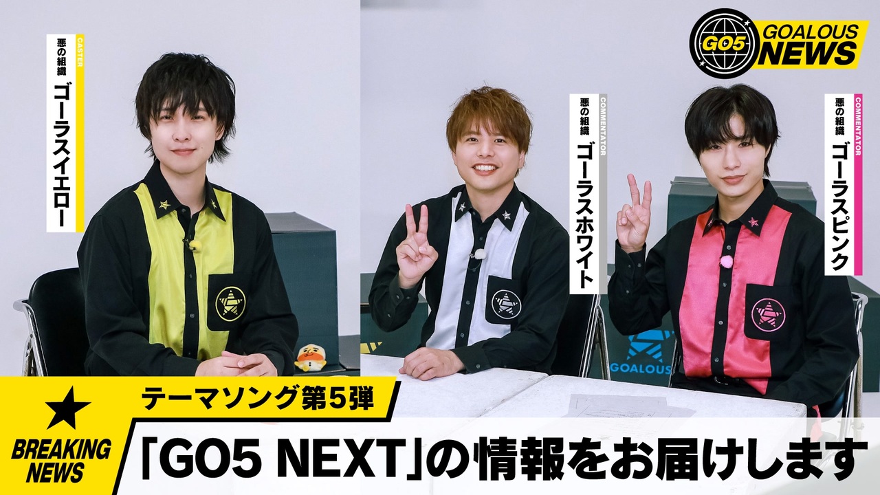 【GOALOUS5 YouTube支部】<br>テーマソング第5弾「GO5 NEXT」の情報をお届けします!<br><br>★テーマソング第5弾「GO5 NEXT」発売記念生放送が決定!<br>12/19(火)20:00〜<br><br><br>★テーマソング第5弾「GO5 NEXT」2024年1月31日発売!予約受付中!<br>①販売店情報<br><GCRESTORE(ジークレストア)><br><a href="https://gcrest.store/collections/goalous5" target="_blank" rel="noopener nofollow">https://gcrest.store/collections/goalous5</a><br><アニメイト(通販含む全店舗)><br><br>※店舗別購入特典は下記ご確認ください<br><br>②収録内容(CD +Blu-ray)<br>【MV盤(CD +Blu-ray)】<br><収録曲><br>01.GO5 NEXT<br>02.ゴーラスたいそう<br>03.GO5 NEXT(Instrumental)<br>04.ゴーラスたいそう(Instrumental)<br><br><Blu-ray映像収録内容><br>01.GO5 NEXT Music Video<br>02.Making<br>03.Trailer<br><br>GCGC-0018/¥2,640円(税込)<br><br>③店舗別購入特典<br>GCRESTORE(ジークレストア):複製直筆コメント入り2L判ブロマイド<br>アニメイトオンライン:L判ブロマイド<br>※特典はなくなり次第、終了となります。<br><br>★4周年記念食事会&戦闘訓練の模様をたっぷり収めた「GOALOUS Training 2023」Blu-ray<br>ジークレストアにて発売中!<br><br>①数量限定ゴーラス盤<br>価格:13,000円(税込)<br>特典:撮り下ろしブロマイド3種、GOALOUS Training Tシャツ<br><a href="https://gcrest.store/collections/goalous5/products/gcp20230153g5" target="_blank" rel="noopener nofollow">https://gcrest.store/collections/goalous5/products/gcp20230153g5</a><br><br>②通常盤<br>価格:8,800円(税込)<br><a href="https://gcrest.store/collections/goalous5/products/gcp20230152g5" target="_blank" rel="noopener nofollow">https://gcrest.store/collections/goalous5/products/gcp20230152g5</a><br><br>※数量限定ゴーラス盤はなくなり次第終了となります。<br>※数量限定ゴーラス盤・通常盤のBlu-ray収録内容は共通です。<br><br>★MISSION:GO5 ボイスドラマVol.04「江戸ノ町ヲ声福セヨ!」発売中!<br>ボイスドラマと新規楽曲「伍色ノ華」も収録!<br><br>①CD販売店情報<br><GCRESTORE(ジークレストア)><br><a href="https://gcrest.store/products/gcp20230113g5" target="_blank" rel="noopener nofollow">https://gcrest.store/products/gcp20230113g5</a><br><アニメイト(通販含む)><br><a href="https://www.animate-onlineshop.jp/pn/pd/2281965/" target="_blank" rel="noopener nofollow">https://www.animate-onlineshop.jp/pn/pd/2281965/</a><br>購入者特典:<br>音声特典ボイスカード(全5種、ランダム)<br>収録内容:各キャラクターの江戸時代シチュエーションボイスを収録<br><br>②コンプリートセット(数量限定)<br>ジークレストアのみでの販売です<br><a href="https://gcrest.store/products/gcp20230114g5" target="_blank" rel="noopener nofollow">https://gcrest.store/products/gcp20230114g5</a><br>購入者特典:<br>音声特典ボイスカード(全5種セット)<br>収録内容:各キャラクターの江戸時代シチュエーションボイスを収録<br>ゴーラスアクリルブロック(MISSION:GO5 Vol.04Ver.)<br><br>※ボイスドラマ、音声特典の収録内容は共通です<br><br>和装姿のアクスタ、卓上のぼり、扇子&手ぬぐいなど、ボイスドラマ関連グッズも発売中!<br><a href="https://gcrest.store/collections/goalous5" target="_blank" rel="noopener nofollow">https://gcrest.store/collections/goalous5</a><br><br> ★悪の相談募集中<br>下記のフォームに記入、投稿をお願いいたします。<br><a href="http://bit.ly/2Q3wMUh" target="_blank" rel="noopener nofollow">http://bit.ly/2Q3wMUh</a><br><br>★GOALOUS5(ゴーラスファイブ)とは<br>世界声福(征服)を目論む悪の組織が、先遣隊として声を生業にする熊谷健太郎、小松昌平、寺島惇太、仲村宗悟、深町寿成を派遣した。それが「GOALOUS5(ゴーラスファイブ)」だ。5人は声を武器に人々を虜にし、世界を声福(征服)していくための活動を行っていく。<br><br>★GOALOUS5の虜になった者は、公式Twitterをフォロー、YouTubeチャンネル登録を<br><br>★GOALOUS5公式Twitter<br>@sir_goalous( <a href="https://twitter.com/sir_goalous" target="_blank" rel="noopener nofollow">https://twitter.com/sir_goalous</a> )<br><br>運営:株式会社ジークレスト<br><a href="https://www.gcrest.com/" target="_blank" rel="noopener nofollow">https://www.gcrest.com/</a>