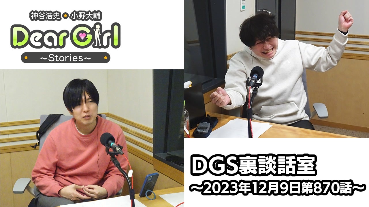 『神谷浩史・小野大輔のDear Girl〜Stories〜』<br>声優・神谷浩史、小野大輔がストーリーテラーとなってラジオの前のたった一人のアナタのために様々なストーリーをお届けするラジオプログラム。<br><br>こちらではDGS本編には収録されていない裏の談話室をお届けします。<br><br>----------<br><br>「Dear Girl〜Stories〜Festival Carnival 15年祭」を収録したBlu-ray&DVDが文化放送A&Gショップで発売中!<br>横浜公演2日目の模様を完全収録!特典映像には、神戸公演両日、横浜公演初日のMASOCHISTIC ONO BAND (MOB)出演パートの日替わり楽曲コーナー(「Merry XXXmas」「Punishment is Reward」「Sweeeet!!」)とメジャーデビュー記者会見の模様を収録!<br>音声特典にはオーディオコメンタリーも!<br><br>▼ご購入はこちら<br>【Blu-ray】<br><a href="https://aandg.shop-pro.jp/?pid=177132372" target="_blank" rel="noopener nofollow">https://aandg.shop-pro.jp/?pid=177132372</a><br>【DVD】<br><a href="https://aandg.shop-pro.jp/?pid=177131752" target="_blank" rel="noopener nofollow">https://aandg.shop-pro.jp/?pid=177131752</a><br><br>----------<br><br>文化放送&ラジオ大阪で放送中のラジオ番組「神谷浩史・小野大輔のDear Girl~Stories~」の第15弾主題歌は、GReeeeNとコラボしてお届け!番組主題歌CD「=」がアニメイト、文化放送A&Gショップにて発売中!<br><br>▼ご購入はこちら <br>アニメイト(特典:B2ポスター)<br><a href="https://www.animate-onlineshop.jp/pn/pd/2242613/ " target="_blank" rel="noopener nofollow">https://www.animate-onlineshop.jp/pn/pd/2242613/ </a><br><br>文化放送A&Gショップ (特典:L判ブロマイド)<br><a href="https://aandg.shop-pro.jp/?pid=173983115" target="_blank" rel="noopener nofollow">https://aandg.shop-pro.jp/?pid=173983115</a><br><br>----------<br><br><br>・放送日時<br>文化放送 毎週(土)25時〜25時30分<br>ラジオ大阪 毎週(日)23時〜23時30分<br>インターネットサイマルラジオradikoでも聴取可能です。<br><br>・公式Twitter<br><a href="https://twitter.com/uchi_P_" target="_blank" rel="noopener nofollow">https://twitter.com/uchi_P_</a><br><br>・番組メールアドレス<br>dgs@joqr.net<br><br>・番組公式サイト<br><a href="https://pc.animelo.jp/special/deargirl-stories/" target="_blank" rel="noopener nofollow">https://pc.animelo.jp/special/deargirl-stories/</a><br>