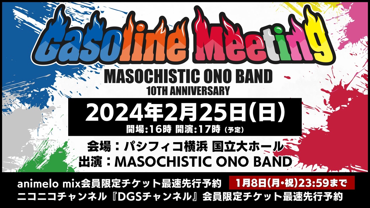 声優・神谷浩史、小野大輔がストーリーテラーとなってラジオの前のたった一人のアナタのために様々なストーリーをお届けする<br>文化放送で放送中のラジオ番組「神谷浩史・小野大輔のDear Girl~Stories~」(DGS)。<br><br>そのDGSから生まれたエアバンドDGSから生まれた6ピースエアバンドMASOCHISTIC ONO BANDのデビュー10周年記念イベントの開催が決定!<br><br>現在、スマートフォンサイト「animelo mix」とニコニコチャンネル「DGSチャンネル」会員限定にて最速先行予約受付中!<br>※応募は両方から可能ですが当選はいずれか一方のみとなります。<br><br><br>【animelo mix会員限定チケット最速先行予約】<br>受付期間:12月18日(月)12:00~1月8日(月・祝)23:59<br>URL:<a href="https://r.animelo.jp/?id=qi30jO7w" target="_blank" rel="noopener nofollow">https://r.animelo.jp/?id=qi30jO7w</a><br>※申し込みはスマートフォン(iPhone、Android)からのみになります。<br><br><br>【ニコニコチャンネル『DGSチャンネル』会員限定チケット最速先行予約】<br>受付期間:12月18日(月)12:00~1月8日(月・祝)23:59<br>URL:<a href="https://ch.nicovideo.jp/dgs" target="_blank" rel="noopener nofollow">https://ch.nicovideo.jp/dgs</a><br>※スマートフォン(iPhone、Android)、PCから申し込み可能です。<br><br><br>【イベント概要】<br>タイトル:MASOCHISTIC ONO BAND 10th Anniversary Gasoline Meeting<br>日程:2024年2月25日(日) 16:00開場 17:00開演(予定)<br>会場:パシフィコ横浜 国立大ホール<br>出演:MASOCHISTIC ONO BAND<br>チケット:指定 8,000円(税別)/ 8,800円(税込)<br><br>※3歳以上有料<br>※無断譲渡転売禁止<br><br>公式サイト:<a href="https://www.joqrextend.co.jp/mob/posts/837" target="_blank" rel="noopener nofollow">https://www.joqrextend.co.jp/mob/posts/837</a><br><br><br>ファンが集う=ファンミーティング、MOBは、普段ファンのことを「ガソリン」と呼んでいるということで「ガソリンミーティング」となりました。<br>10年で初のファンミーティングもとい「ガソリンミーティング」に是非遊びにきてください!<br><br><br>「神谷浩史・小野大輔のDear Girl~Stories~」(DGS)のニコニコチャンネル「DGSチャンネル」も更新中です。<br><a href="https://ch.nicovideo.jp/dgs" target="_blank" rel="noopener nofollow">https://ch.nicovideo.jp/dgs</a><br><br>月額550円(税込)の有料会員制で、チャンネル会員向けに、録り下ろしの音声コンテンツ「裏談話室」や<br>過去の放送を再編集したディレクターズカット版、動画コンテンツ、ブロマガ等を配信しています。是非チャンネル登録よろしくお願いします。<br><br><br><番組情報><br><br>・放送日時<br>文化放送 毎週(土)25時〜25時30分<br>ラジオ大阪 毎週(日)23時〜23時30分<br>インターネットサイマルラジオradikoでも聴取可能です。<br><br>・公式Twitter<br><a href="https://twitter.com/uchi_P_" target="_blank" rel="noopener nofollow">https://twitter.com/uchi_P_</a><br><br>・番組メールアドレス<br>dgs@joqr.net<br><br>・番組公式サイト<br><a href="https://pc.animelo.jp/special/deargirl-stories/" target="_blank" rel="noopener nofollow">https://pc.animelo.jp/special/deargirl-stories/</a><br><br>#DGS<br>#神谷浩史<br>#小野大輔<br>