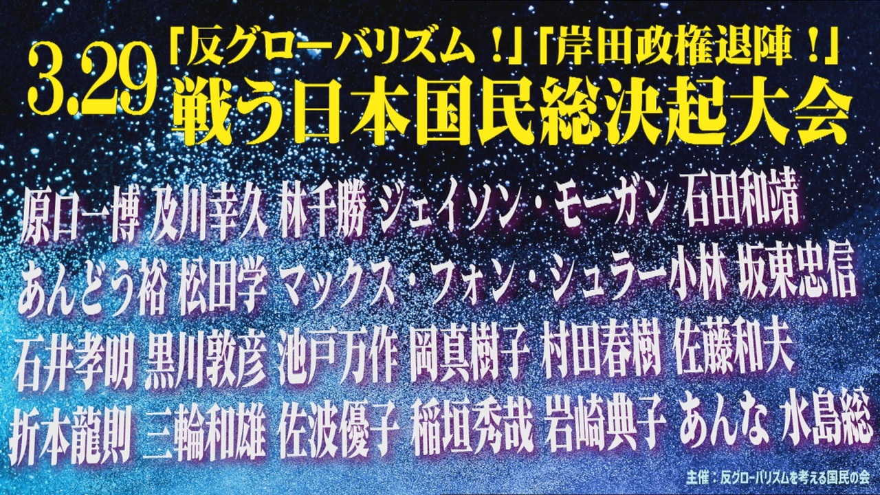 3月29日に、東京・星稜会館で行われた『「反グローバリズム!」「岸田政権退陣!」戦う日本国民総決起大会』の模様を、アーカイブでお送りします。<br><br>〜〜〜〜〜〜〜〜〜〜〜〜〜〜〜〜〜〜〜〜〜〜〜〜〜〜〜<br>0:00:00 司会あいさつ(水島総 / 佐波優子)<br>0:14:44 歌(あんな(シンガーソングライター)<br>0:24:07 原口一博(衆議院議員)<br>0:31:41 及川幸久(作家)<br>0:40:40 林千勝(近現代史研究家)<br>0:55:41 ジェイソン・モーガン(歴史学者・麗澤大学国際学部准教授)<br>1:01:58 石田和靖(国際情勢YouTuber“越境3.0チャンネル”)<br>1:18:26 あんどう裕(前衆議院議員)<br>1:25:09 松田学(松田政策研究所代表・「参政党」前代表)<br>1:33:11 マックス・フォン・シュラー小林(元米海兵隊・歴史研究家)<br>1:35:48 坂東忠信(元警視庁通訳捜査官・外国人犯罪防犯講師)<br>1:43:12 石井孝明(ジャーナリスト)<br>1:52:48 黒川敦彦(「つばさの党」代表)<br>1:58:40 池戸万作(政治経済評論家)<br>2:03:27 岡真樹子(「愛国女性のつどい花時計」代表)<br>2:18:07 村田春樹(「今さら聞けない皇室研究会」顧問)<br>2:25:49 佐藤和夫(「英霊の名誉を守り顕彰する会」会長)<br>2:28:35 折本龍則(千葉県議会議員)<br>2:32:01 三輪和雄(「日本世論の会」会長・「くにもり衆」常任幹事・「頑張れ日本全国行動委員会」常任幹事)<br> 稲垣秀哉(「新党くにもり関西」代表・「くにもり衆」兵庫代表)<br> 岩崎典子(「くにもり衆関西」)<br>〜〜〜〜〜〜〜〜〜〜〜〜〜〜〜〜〜〜〜〜〜〜〜〜〜〜〜<br><br>◆チャンネル桜の人気番組「闘論!倒論!討論!」支援会員募集!<br> 「がんばれ!『闘論!倒論!討論!』」会員 お申し込みはこちらから<br> <a href="http://www.ch-sakura.jp/1636.html" target="_blank" rel="noopener nofollow">http://www.ch-sakura.jp/1636.html</a><br><br>◆ウイグル「ジェノサイド」国会議員アンケート・集計結果<br> <a href="http://www.ch-sakura.jp/1633.html" target="_blank" rel="noopener nofollow">http://www.ch-sakura.jp/1633.html</a><br><br>◆新党くにもり<br> <a href="https://kunimoritou.jp/" target="_blank" rel="noopener nofollow">https://kunimoritou.jp/</a><br><br>◆YOU TUBE くにもりチャンネル<br> <a href="https://www.youtube.com/channel/UCddaV46UHXJNtXybu2oBcgQ/featured" target="_blank" rel="noopener nofollow">https://www.youtube.com/channel/UCddaV46UHXJNtXybu2oBcgQ/featured</a><br><br>◆頑張れ日本!全国行動委員会<br> <a href="http://www.ganbare-nippon.net/" target="_blank" rel="noopener nofollow">http://www.ganbare-nippon.net/</a><br><br>◆ウイグル「ジェノサイド」国会議員アンケート・集計結果<br> <a href="http://www.ch-sakura.jp/1633.html" target="_blank" rel="noopener nofollow">http://www.ch-sakura.jp/1633.html</a><br><br>◆有料番組 ch桜大学開校!<br> <a href="https://sakura-daigaku.jp/" target="_blank" rel="noopener nofollow">https://sakura-daigaku.jp/</a><br><br>◆チャンネル桜・別館<br> <a href="https://www.youtube.com/channel/UCGbSDhzR4hbRAmSuRK-z_ng" target="_blank" rel="noopener nofollow">https://www.youtube.com/channel/UCGbSDhzR4hbRAmSuRK-z_ng</a><br><br>※チャンネル桜では、自由且つ独立不羈の放送を守るため、『日本文化チャンネル桜二千人委員会』の会員を募集しております。以下のページでご案内申し上げておりますので、全国草莽の皆様のご理解、ご協力を、何卒宜しくお願い申し上げます。<br> <a href="http://www.ch-sakura.jp/579.html" target="_blank" rel="noopener nofollow">http://www.ch-sakura.jp/579.html</a><br><br>◆チャンネル桜公式HP<br> <a href="http://www.ch-sakura.jp/" target="_blank" rel="noopener nofollow">http://www.ch-sakura.jp/</a>