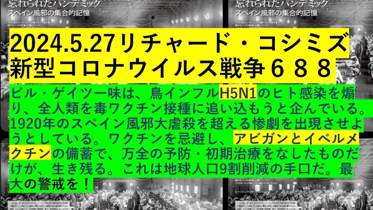 2024.5.27リチャード・コシミズ新型コロナウイルス戦争688<br>ビル・ゲイツ一味は、鳥インフルH5N1のヒト感染を煽り、全人類を毒ワクチン接種に追い込もうと企んでいる。1920年のスペイン風邪大虐殺を超える惨劇を出現させようとしている。ワクチンを忌避し、アビガンとイベルメクチンの備蓄で、万全の予防・初期治療をなしたものだけが、生き残る。これは地球人口9割削減の手口だ。最大の警戒を!<br>