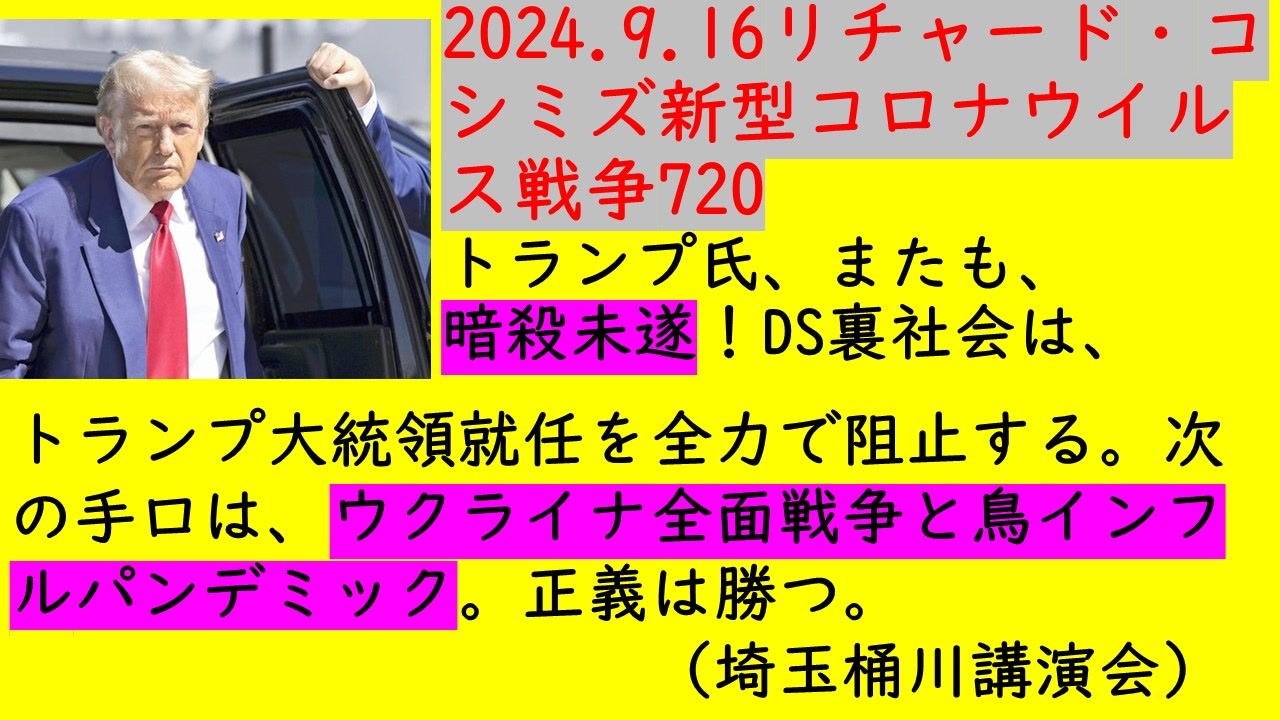 2024.9.16リチャード・コシミズ新型コロナウイルス戦争720<br>トランプ氏、またも、暗殺未遂!DS裏社会は、トランプ大統領就任を全力で阻止する。次の手口は、ウクライナ全面戦争と鳥インフルパンデミック。正義は勝つ。<br> (埼玉桶川講演会)<br>