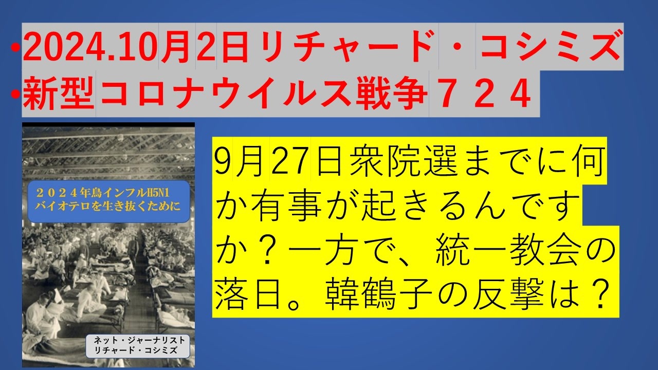 •2024.10月2日リチャード・コシミズ•新型コロナウイルス戦争724<br><br>10月27日衆院選までに何か有事が起きるんですか?一方で、統一教会の落日。韓鶴子の反撃は?<br>