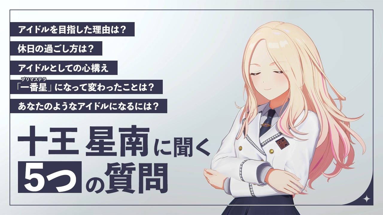 初星学園の一番星(プリマステラ)にして生徒会長・十王 星南に、<br>5つの質問をぶつけたインタビュー動画を公開いたします。<br>▼十王 星南オフィシャルサイト<br><a href="https://juo-sena.idolmaster-official.jp/" target="_blank" rel="noopener nofollow">https://juo-sena.idolmaster-official.jp/</a><br><br><br><br>▼学マス 好評配信中!▼<br><a href="http://app.adjust.com/1ai6ouao" target="_blank" rel="noopener nofollow">http://app.adjust.com/1ai6ouao</a><br><br>▼学マス関連リンク▼<br>・公式サイト<br><a href="https://gakuen.idolmaster-official.jp/" target="_blank" rel="noopener nofollow">https://gakuen.idolmaster-official.jp/</a><br>・公式X(旧:Twitter)<br><a href="https://x.com/gkmas_official" target="_blank" rel="noopener nofollow">https://x.com/gkmas_official</a>