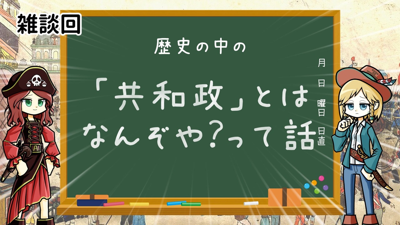 共和政という言葉があります。<br>共に和して政治をやっていこうね!ってことですね。<br><br>現代では君主政と対立する概念で、王や皇帝といった君主を持たず、民衆によって統治される政治体制とされます。<br>でも歴史を見るとそうじゃないケースもあるし、じゃあ共和政ってどう扱えばいいのって感じのまとめです。<br><br>動画のテーマとして地味すぎるやろ。<br><br>━━━━━━━━━━━━━━━━━━━━━<br>投稿者共通情報☆彡<br><br>BGM, SE:ニコニ・コモンズ様<br><a href="http://commons.nicovideo.jp/" target="_blank" rel="noopener nofollow">http://commons.nicovideo.jp/</a><br>魔王魂様<br><a href="https://maoudamashii.jokersounds.com/" target="_blank" rel="noopener nofollow">https://maoudamashii.jokersounds.com/</a><br>Audiostock様<br><a href="https://audiostock.jp/" target="_blank" rel="noopener nofollow">https://audiostock.jp/</a><br><br>立ち絵 霊夢・魔理沙(黒子式):nicotalk様<br><a href="http://www.nicotalk.com/charasozai.html" target="_blank" rel="noopener nofollow">http://www.nicotalk.com/charasozai.html</a><br><br>立ち絵 パトラ、マリー、アン、メアリ:ライフライフ様<br><a href="https://0801lifelife.tumblr.com/" target="_blank" rel="noopener nofollow">https://0801lifelife.tumblr.com/</a><br><br>使用ツール1:ゆっくりムービーメーカー3<br><a href="https://manjubox.net/ymm3/" target="_blank" rel="noopener nofollow">https://manjubox.net/ymm3/</a><br><br>使用ツール2:AviUtl<br><a href="http://spring-fragrance.mints.ne.jp/aviutl/" target="_blank" rel="noopener nofollow">http://spring-fragrance.mints.ne.jp/aviutl/</a><br><br>各時代の地図 : World History Maps & Timelines <br><a href="http://geacron.com/home-en/" target="_blank" rel="noopener nofollow">http://geacron.com/home-en/</a><br><br>ゆっくりボイスについて:AquesTalkライセンス取得済み<br><br>キャラクターボイス<br>アン・ボニー:羽ノ華(A.I.VOICE)<br>メアリ・リード:琴葉 葵(A.I.VOICE)<br>クレオパトラ:結月ゆかり(VOICEROID2)<br>マリー‐アントワネット:東北きりたん (VOICEROID EX)<br><br>他:<br>青山龍星 (A.I. VOICE )<br>伊織結弦 (A.I.VOICE2 )<br>宮舞モカ、フリモメン (VOICEPEAK )<br><br><br>その他フリー素材ご提供元の皆様に圧倒的感謝<br><br><br>
