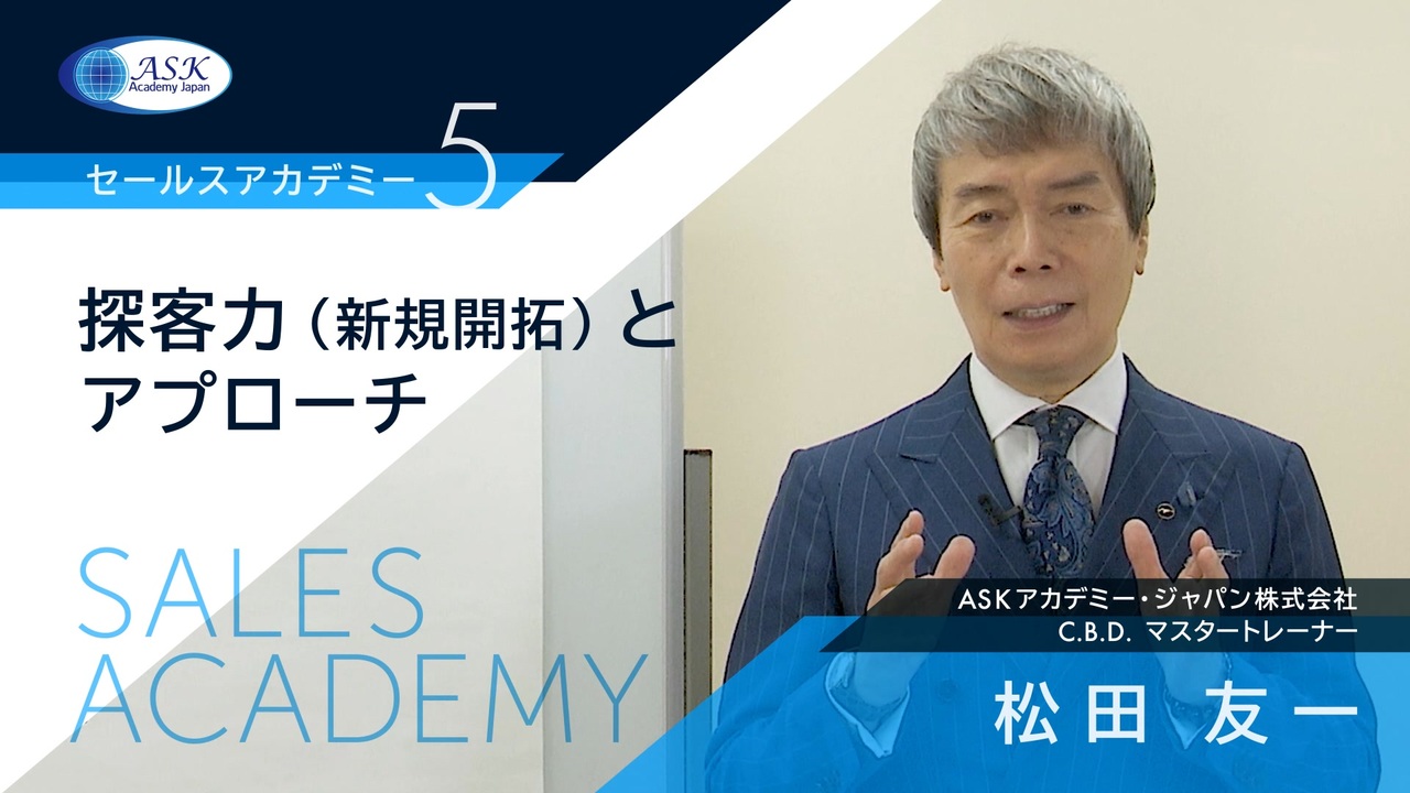 この動画では、ASKアカデミーが提供するセールスアカデミーから『探客力(新規開拓)とアプローチ』についての最新の内容を学ぶことができます。<br>セールスアカデミーとは、セールスにおける重要な8つの機能を学び爆発的な成果をつくり出すことが目的のカリキュラムです。<br>セールスの現場で『新規開拓にこだわる理由と、どのようにアプローチすることでお客様に最大限の貢献ができるのか』を理解し顧客とどのような関係を築くのかを本質から学び、実践することで、販売の現場を根本的に変えて、顧客に貢献することによって、成果を最大限にしていきましょう。<br>講師はセールスの達人、松田友一です。某最大手自動車販売会社で新人賞の受賞に始まり、年間優秀セールスマン表彰受賞など、数々の賞、タイトルを総なめにした経験に基づく基礎基本、原理原則をお伝えします。<br><br><br>ニコニコチャンネル「教育研修のASKアカデミー」には、日々の現場で直面する課題を解決し、目標達成をするために生涯を通して、繰り返し学び続ける価値のあるコンテンツだけを提供しています。成果が出ていない時は改善できるように、成果が出ている時には再現できるようご活用ください。(<a href="https://ch.nicovideo.jp/ask-gc)" target="_blank" rel="noopener nofollow">https://ch.nicovideo.jp/ask-gc)</a><br>ニコニコチャンネル<br>月額登録はこちらから→<a href="https://ch.nicovideo.jp/ask-gc/join?hash=1679208802" target="_blank">https://ch.nicovideo.jp/ask-gc/join?hash=1679208802</a><br><br><br>松田友一<br>プロフィール:<a href="https://www.ask-gc.com/tutor_info/tutorID/9" target="_blank">https://www.ask-gc.com/tutor_info/tutorID/9</a><br>提供 ASKアカデミー・ジャパン Inc.<br>HP:<a href="https://www.ask-gc.com/" target="_blank">https://www.ask-gc.com/</a><br>Facebook:<a href="https://www.facebook.com/askacademyjapan" target="_blank">https://www.facebook.com/askacademyjapan</a><br>