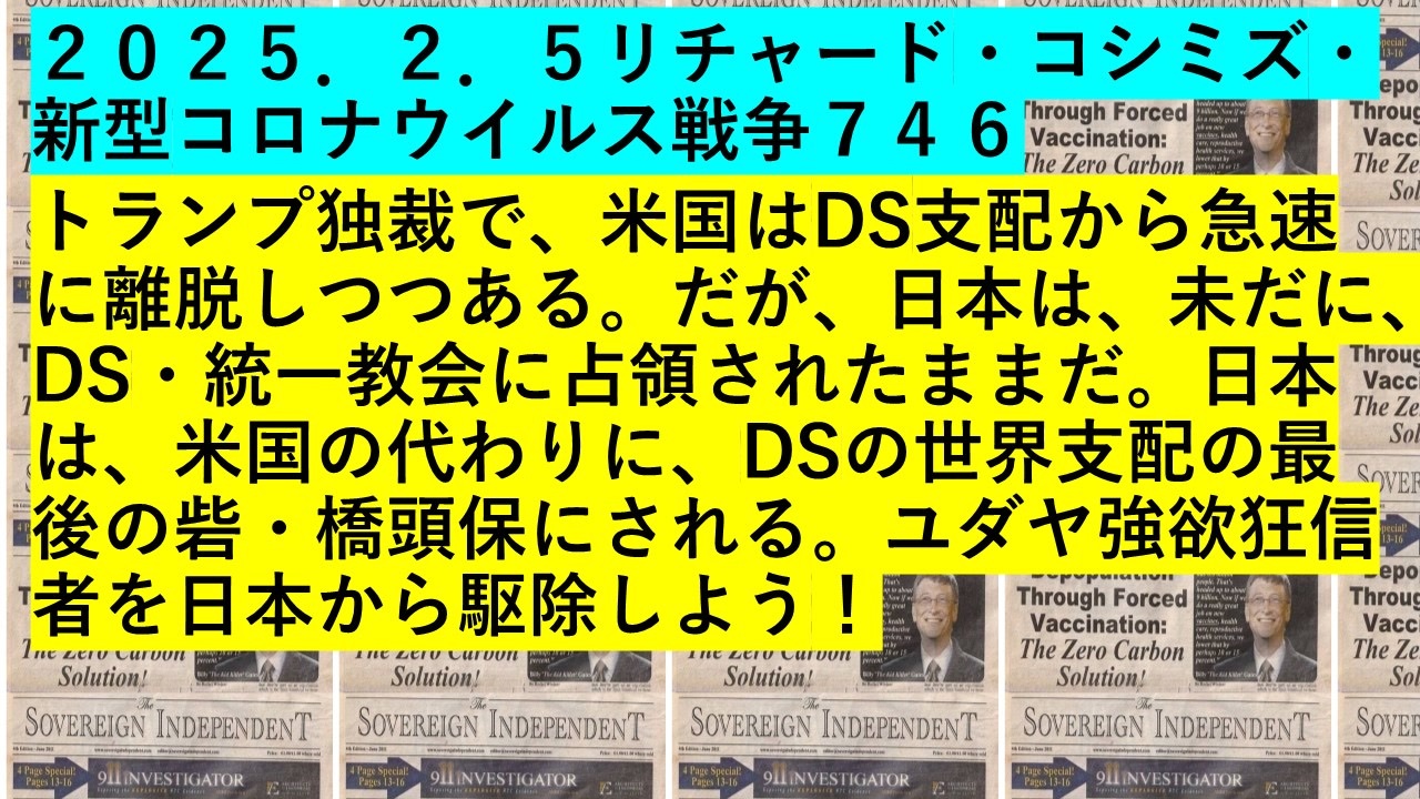 2025.2.5リチャード・コシミズ・新型コロナウイルス戦争746<br>トランプ独裁で、米国はDS支配から急速に離脱しつつある。だが、日本は、未だに、DS・統一教会に占領されたままだ。日本は、米国の代わりに、DSの世界支配の最後の砦・橋頭保にされる。ユダヤ強欲狂信者を日本から駆除しよう!<br>