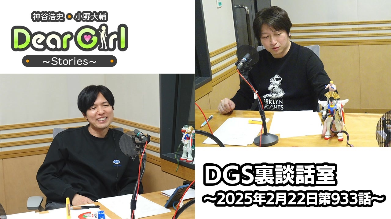 『神谷浩史・小野大輔のDear Girl〜Stories〜』<br>声優・神谷浩史、小野大輔がストーリーテラーとなってラジオの前のたった一人のアナタのために様々なストーリーをお届けするラジオプログラム。<br><br>こちらではDGS本編には収録されていない裏の談話室をお届けします。<br><br>---------- <br><br>スタジオを飛び出してリスナーの住む街に行ってお届けする「アウトドアラジオ」として 実施する番組リスナーファンミーティング「DGS CAMP」を大阪と岩手で開催!<br> 現在スマートフォンサイト「animelo mix」とニコニコチャンネル「DGSチャンネル」会員限定にて最速先行予約を受付中! <br>【animelo mix会員限定チケット最速先行予約】<br> 受付期間:2月10日(月)12時~3月3日(月)23時59分<br>URL:<a href="https://r.animelo.jp/?id=YCFps2Zq" target="_blank" rel="noopener nofollow">https://r.animelo.jp/?id=YCFps2Zq</a><br>※申し込みはスマートフォン(iPhone、Android)からのみになります。<br><br> 【ニコニコチャンネル『DGSチャンネル』会員限定チケット最速先行予約】<br>受付期間:2月10日(月)12時~3月3日(月)23時59分<br>URL:<a href="https://ch.nicovideo.jp/dgs" target="_blank" rel="noopener nofollow">https://ch.nicovideo.jp/dgs</a><br>※スマートフォン(iPhone、Android)、PCから申し込み可能です。 <br><br>【「DGS CAMP 2025」イベント概要】<br>タイトル:DGS CAMP 2025<br>出演:神谷浩史、小野大輔<br>■DGS CAMP 2025 in 大阪<br>会場:箕面市立文化芸能劇場 大ホール<br>2025年6月1日(日) 昼公演/夜公演<br>■DGS CAMP 2025 in 岩手<br>会場:奥州市文化会館Zホール<br>2025年6月8日(日) 昼公演/夜公演<br><br>----------<br><br>DGS発のエアバンド「MASOCHISTIC ONO BAND」(MOB)のデビュー10周年を記念したイベント「MASOCHISTIC ONO BAND 10th Anniversary Gasoline Meeting」イベントBlu-rayの発売が決定!<br><br>▼ご予約はこちら!<br><a href="https://extendshop.jp/products/4582494262615" target="_blank" rel="noopener nofollow">https://extendshop.jp/products/4582494262615</a><br><br>----------<br><br><br>・放送日時<br>文化放送 毎週(土)25時〜25時30分<br>ラジオ大阪 毎週(日)23時〜23時30分<br>インターネットサイマルラジオradikoでも聴取可能です。<br><br>・公式Twitter<br><a href="https://twitter.com/uchi_P_" target="_blank" rel="noopener nofollow">https://twitter.com/uchi_P_</a><br><br>・番組メールアドレス<br>dgs@joqr.net<br><br>・番組公式サイト<br><a href="https://pc.animelo.jp/special/deargirl-stories/" target="_blank" rel="noopener nofollow">https://pc.animelo.jp/special/deargirl-stories/</a><br><br><br>