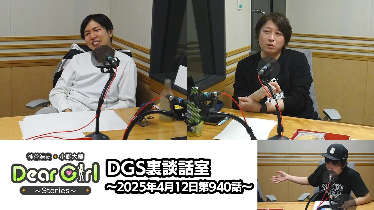 『神谷浩史・小野大輔のDear Girl〜Stories〜』<br>声優・神谷浩史、小野大輔がストーリーテラーとなってラジオの前のたった一人のアナタのために様々なストーリーをお届けするラジオプログラム。<br><br>こちらではDGS本編には収録されていない裏の談話室をお届けします。<br><br>---------- <br><br>スタジオを飛び出してリスナーの住む街に行ってお届けする「アウトドアラジオ」として 実施する番組リスナーファンミーティング「DGS CAMP」を大阪と岩手で開催!<br><br> 現在チケットプレリザーブ受付中!<br>※大阪公演の受付はございません<br>受付期間:2025年4月8日(火)12:00~4月21日(月)23:59<br><br>▼申し込みはこちら!<br> <a href="https://joqrextend.co.jp/dgscamp2025/ticket/" target="_blank" rel="noopener nofollow">https://joqrextend.co.jp/dgscamp2025/ticket/</a><br><br>【「DGS CAMP 2025」イベント概要】<br>タイトル:DGS CAMP 2025<br>出演:神谷浩史、小野大輔<br>■DGS CAMP 2025 in 大阪<br>会場:箕面市立文化芸能劇場 大ホール<br>2025年6月1日(日) 昼公演/夜公演<br>■DGS CAMP 2025 in 岩手<br>会場:奥州市文化会館Zホール<br>2025年6月8日(日) 昼公演/夜公演<br><br>----------<br><br>DGS発のエアバンド「MASOCHISTIC ONO BAND」(MOB)のデビュー10周年を記念したイベント「MASOCHISTIC ONO BAND 10th Anniversary Gasoline Meeting」イベントBlu-rayの発売!<br><br>▼ご購入はこちら!<br><a href="https://extendshop.jp/products/4582494262615" target="_blank" rel="noopener nofollow">https://extendshop.jp/products/4582494262615</a><br><br>----------<br><br><br>・放送日時<br>文化放送 毎週(土)25時〜25時30分<br>ラジオ大阪 毎週(日)23時〜23時30分<br>インターネットサイマルラジオradikoでも聴取可能です。<br><br>・公式Twitter<br><a href="https://twitter.com/uchi_P_" target="_blank" rel="noopener nofollow">https://twitter.com/uchi_P_</a><br><br>・番組メールアドレス<br>dgs@joqr.net<br><br>・番組公式サイト<br><a href="https://pc.animelo.jp/special/deargirl-stories/" target="_blank" rel="noopener nofollow">https://pc.animelo.jp/special/deargirl-stories/</a><br><br><br>