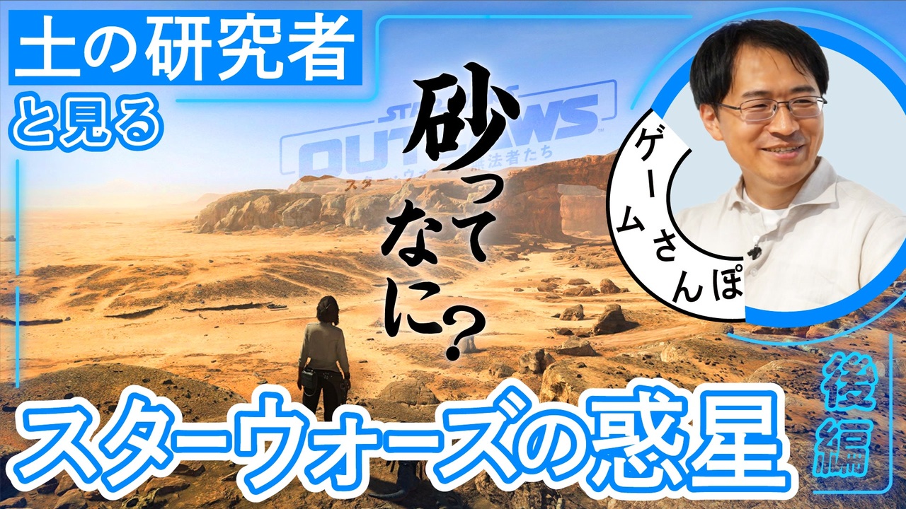 プロモーション:スターウォーズ 無法者たち(Ubisoft)<br><br>後編ではスターウォーズファンにとってはお馴染みの砂漠に包まれた惑星タトゥーインの土壌を見ていきます〜。前編で見てきた惑星とは違い、植物がほぼ生えていない不毛の惑星の砂や地形、暮らしについて考えていきます。<br><br>▽ゲーム情報<br>『スター・ウォーズ 無法者たち』のDLC第2弾「A Pirate’s Fortune」ストーリーパックが現在発売中!<br>また、Switch 2版が2025年9月4日に発売開始!<br><a href="https://www.ubisoft.com/ja-jp/game/star-wars/outlaws" target="_blank" rel="noopener nofollow">https://www.ubisoft.com/ja-jp/game/star-wars/outlaws</a><br><br>その他にも、無料体験版が対応する各プラットフォームにて配信中なのでぜひプレイしてみてください〜!<br>#StarWarsOutlaws #StarWars #Ubisoft<br><br>===================================<br>▽メンバーシップ登録はこちら💁<br><a href="https://www.youtube.com/channel/UCcTuSuH_yELJQYU6YZUHsAA/join" target="_blank" rel="noopener nofollow">https://www.youtube.com/channel/UCcTuSuH_yELJQYU6YZUHsAA/join</a><br>▽「ゲームさんぽ/よそ見」へのお仕事のご依頼・ご相談はこちら💁<br><a href="https://gamesampo.com/" target="_blank" rel="noopener nofollow">https://gamesampo.com/</a><br>gamesampo@yosomi.co.jp<br>===================================<br><br>【出演者】<br>藤井一至(土の研究者)<br><a href="https://x.com/virtualsoil" target="_blank" rel="noopener nofollow">https://x.com/virtualsoil</a><br><br>いいだ(よそ見)<br><a href="https://twitter.com/UraIida" target="_blank" rel="noopener nofollow">https://twitter.com/UraIida</a><br>マスダ(ゲーマー)<br><a href="https://twitter.com/game_masuda" target="_blank" rel="noopener nofollow">https://twitter.com/game_masuda</a><br><br>【制作】<br>editor:Kawanobe & Iida & Masuda<br>art direction/design:KANAISASAKI<br>op motion design:Hiromu Oka<br>op music:Hercelot<br><br>===================================<br><br><ところでゲームさんぽって...?><br>いろんな人と一緒にゲームをやって、視点の違い、もっと言えば世界の見え方の違いっぷりを楽しむ動画シリーズです。<br><br>よければ発案者である「なむ」さんのサイトにもお参りして、企画の歴史を辿ってみてね!<br><a href="https://www.saynum.com/" target="_blank" rel="noopener nofollow">https://www.saynum.com/</a>