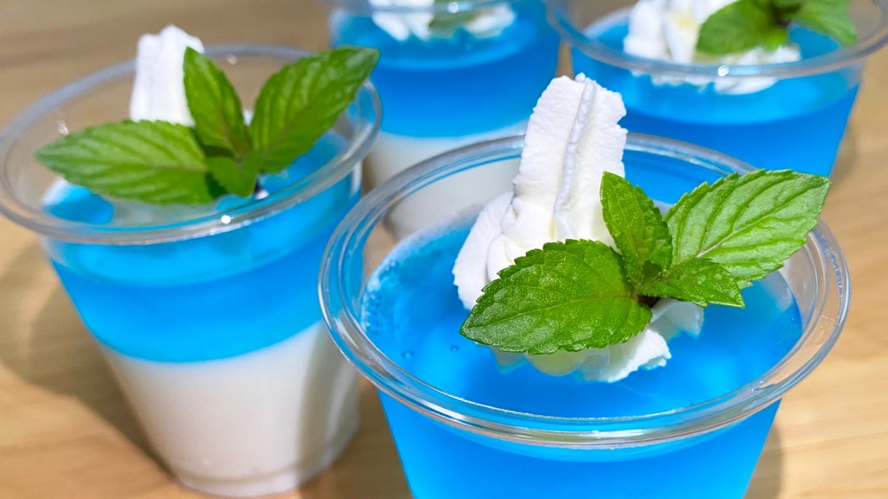 どうも、仕掛人です!<br>弊社では先日ビジネス講習がありまして、「アサイン」「アジェンダ」「エビデンス」といったカタカナを多用する方々が溢れており、辟易しております。<br>中でも一番苦手なカタカナは「リテイク」ですね。ええ、おかげさまで日々「モックアップ_最終版3_final2_last_fix.html」のような化け物を生み出しております。<br>茶番同様、長いファイル名はあまり良いものではありませんね!<br><br>さて今回は、ブルーハワイシロップを使ったブルーハワイゼリーをご紹介します!<br>夏らしくて、透き通った見た目が可愛らしく、写真映えもしますよ♪<br>これとはちょっと違いますが、静岡の沼津港にある「深海プリン」をご存知ですか?<br>とても美味しかったので、静岡にいらっしゃった際はぜひ行ってみてくださいね♪<br><br>チャンネル[☆フォロー]はこちら!<br><a href="https://ch.nicovideo.jp/sikake?rf=nvpc&rp=watch&ra=video_information" target="_blank" rel="noopener nofollow">https://ch.nicovideo.jp/sikake?rf=nvpc&rp=watch&ra=video_information</a><br><br>✨Twitter✨<br><a href="https://x.com/sikaken" target="_blank" rel="noopener nofollow">https://x.com/sikaken</a><br><br>----------<br>ブルーハワイゼリー(ミニカップ4個)<br>----------<br>■ミルクゼリー(下層)<br>牛乳 … 200ml<br>砂糖 … 大さじ2杯<br>粉ゼラチン … 2.5g(1/2袋)<br>バニラオイル…少々(なくていい)<br><br>■ブルーハワイゼリー(上層)<br>水 … 140ml<br>ブルーハワイシロップ大さじ3(60g)<br>粉ゼラチン … 2.5g(1/2袋)<br><br>■トッピング<br>生クリーム<br>ミント<br>----------<br>【作り方】<br>①牛乳と砂糖を中火で温めて砂糖を溶かし、沸騰前に火を止める。<br>②大さじ1の水でふやかしたゼラチンを入れよく溶かす。<br>③粗熱を取って器に注ぎ、冷蔵庫で2時間冷やし固める。<br>④水とブルーハワイシロップを中火で温めて、沸騰前に火を止める。<br>⑤大さじ1の水でふやかしたゼラチンを入れよく溶かす。<br>⑥粗熱を取って器に注ぎ、冷蔵庫で2時間冷やし固める。<br>⑦トッピングをして完成。<br>----------<br>完全に固まっていないとにじむので、気をつけてね。<br>僕のように氷水で完全に熱を取ってから冷やせば、冷蔵庫で1時間くらい冷やせば固まるよ。<br>カップはダイソーのクリアカップ110ml 20個入です。<br><br><br><br>