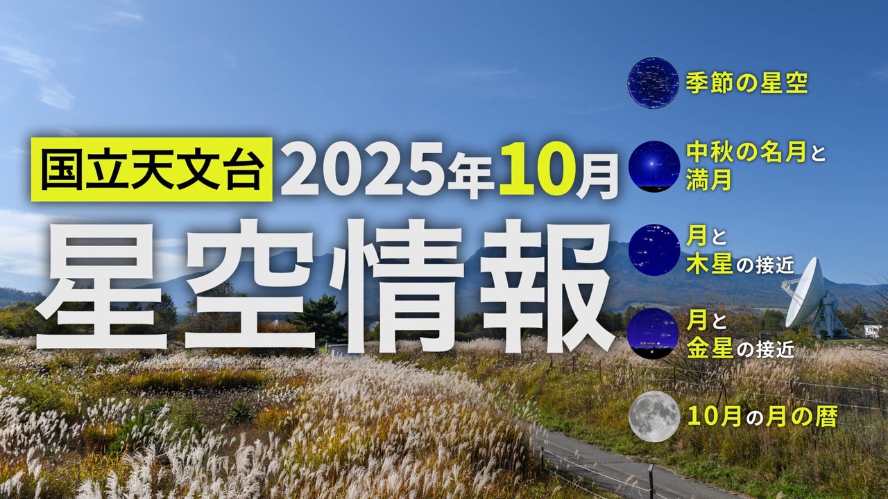 2025年10月の星空情報です。<br><br>10月の宵の空では、夏の大三角が西に傾き、代わって南から東の空に秋の星座が出そろいます。 <br>季節の移ろいを感じながら、星空を見上げてみましょう。 <br><br>今年の中秋の名月は10月6日。翌7日が満月です。 <br>中秋の名月は、太陰太陽暦の8月15日の月を指し、必ずしも満月と一致するとは限りません。 <br>今年は名月と満月の日付が1日ずれています。 <br>名月の近くには土星が輝いていますので、お月見の際にはぜひ探してみてください。 <br><br>10月13日の深夜から14日の明け方にかけては、東の空で下弦の月と木星が並んで見えます。 <br><br>明るい木星と月の共演を楽しめます。 <br>19日と20日の明け方には、東の低い空で細い月に金星が寄り添います。 <br>空が明るくなって見つけづらいかもしれませんが、東の地平線までひらけた場所で探してみるとよいでしょう。<br><br>〇10月の月の暦 7日:満月 14日:下弦 21日:新月 30日:上弦