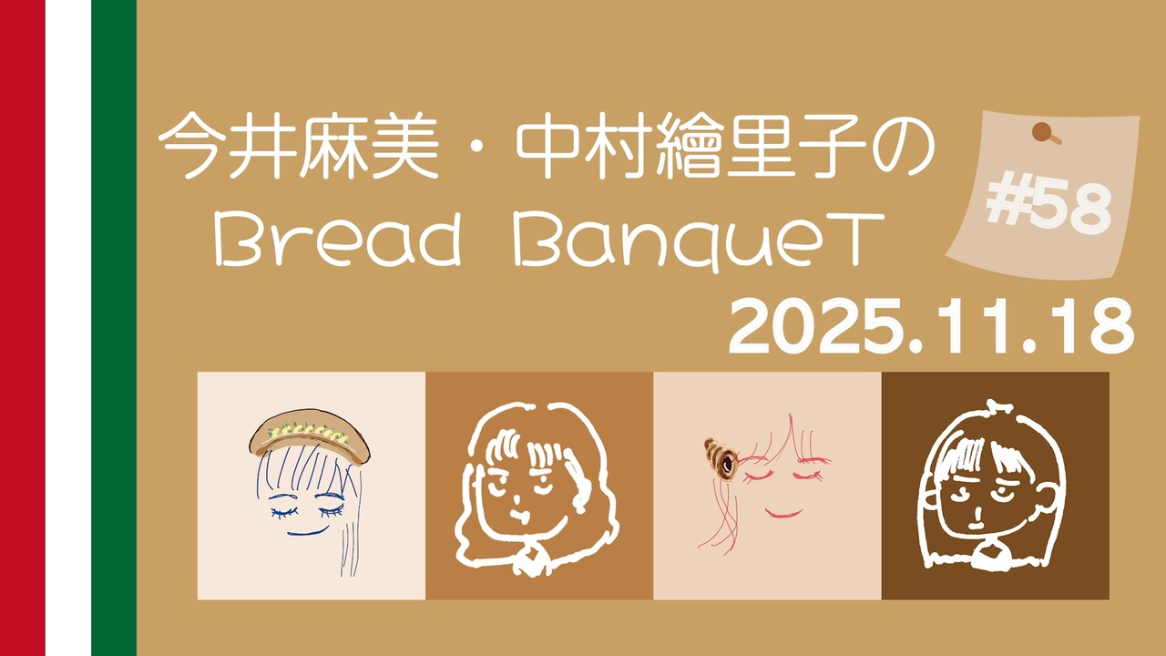 この番組は、声優今井麻美(ミンゴス)、中村繪里子によるラジオ番組です。(アーカイブ配信)<br>本放送はニコニコ動画にて、軽快に繰り広げられる無限に続くトークを、パンの日(8.18.28)にお届けします。<br>毎月 8日 18日 28日の夜10時から!<br><br>2024年8月28日よりにニコニコ動画、YouTubeにてサイマル配信されています。<br><br><11月の配信予定><br>#57:11月8日配信<br>#58:11月18日配信<br>#59:11月28日生配信 ※20時スタート予定<br><br>《チャンネルメンバーシップ概要》<br>www.youtube.com/@BreadBanqueT/join<br>チャンネルページの「メンバーになる」ボタンをクリックすると、詳細情報が表示されます。<br><br><主なチャンネルメンバーシップ特典><br>・メンバー限定の動画コンテンツ「Speciality」の視聴<br>・メンバー限定ブロマガの閲覧<br>・コメントやチャットで使用できるカスタム絵文字やバッジ<br><br>【この番組では各コーナー宛にお便りを募集しています】<br>・「〇〇をただ駄弁るダケ〜略して だ駄ダ〜」 <br>〇〇の部分をおくって、えりんごすのお喋りを助けよう‼<br><br>・お試し企画「〇〇のコト FOR えりんごす」<br>現在、各地の空港に関する情報をお待ちしています‼️<br><br> ・その他 ふつおたも受け付けています<br><br>メールの宛先は 〈bbt.eringosu@gmail.com〉<br>各コーナータイトルをメールの題名に書いて送ってくださいね<br>番組特製ノベルティが欲しい方は<br>・本名<br>・住所<br>・電話番号<br>もお忘れなく<br><br>///// 今井麻美・中村繪里子のBread BanqueT【公式通販サイト】/////<br><a href="https://bread-banquet.square.site/" target="_blank" rel="noopener nofollow">https://bread-banquet.square.site/</a><br><br>///// 今井麻美・中村繪里子のBread BanqueT【ニコニコ動画】/////<br><a href="https://ch.nicovideo.jp/bbt-eringosu" target="_blank" rel="noopener nofollow">https://ch.nicovideo.jp/bbt-eringosu</a><br><br><br>#ぶればん <br>#今井麻美<br>#中村繪里子<br>#えりんごす<br>
