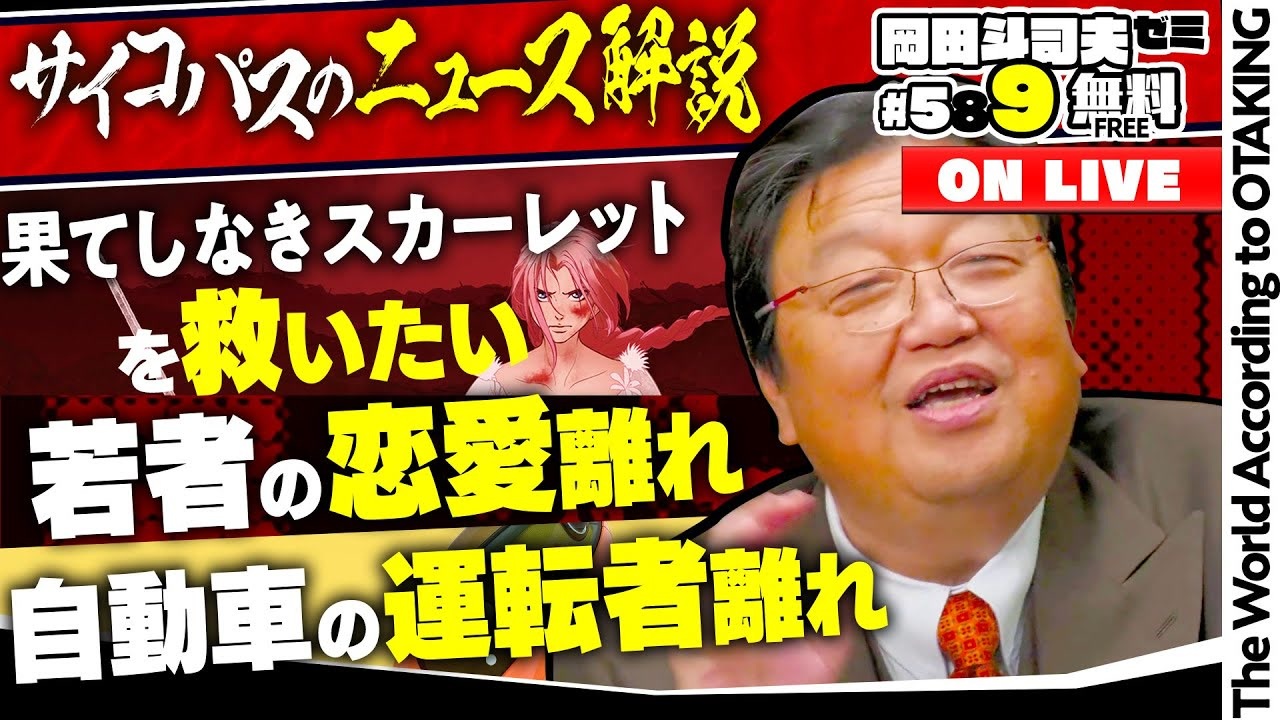 <a href="#" class="seekTime" data-seekTime="24:38" onclick="seekNicoPlayer('#24:38'); return false;">#24:38</a> 限定<br><br><strong>プレミアム</strong>はこちら<br><a href="https://nico.ms/so45657466?from=3358" target="_blank" rel="noopener nofollow">https://nico.ms/so45657466?from=3358</a><br><br>━━━━━━━━━━━━━━━━━━━━━━━<br><strong>紹介URL</strong><br>今、カレがいるのは恥ずかしいことなのか?<br>→ <a href="https://www.vogue.co.jp/article/is-having-a-boyfriend-embarrassing-now" target="_blank" rel="noopener nofollow">https://www.vogue.co.jp/article/is-having-a-boyfriend-embarrassing-now</a><br><br>トヨタ、10年後に「子供向け自動運転車」発売か<br>→ <a href="https://jidounten-lab.com/u_57954" target="_blank" rel="noopener nofollow">https://jidounten-lab.com/u_57954</a><br><br>『鬼滅の刃』世界興行収入1000億円超えのインパクト、日本アニメがハリウッドビジネスを凌駕しはじめた理由<br>→ <a href="https://jbpress.ismedia.jp/articles/-/91764" target="_blank" rel="noopener nofollow">https://jbpress.ismedia.jp/articles/-/91764</a><br><br>【社会の分断がついにエンタメを破壊】なぜアメリカ人はNetflixを“即キャンセル”したのか?<br>→ <a href="https://youtu.be/0pe7v50uQTE?si=akJMIGMq4PCNDDnD" target="_blank" rel="noopener nofollow">https://youtu.be/0pe7v50uQTE?si=akJMIGMq4PCNDDnD</a><br><br>━━━━━━━━━━━━━━━━━━━━━━━<br>◆お便り投稿フォーム<br> <a href="https://forms.gle/FqArc9gLPLZp3Vov7" target="_blank" rel="noopener nofollow">https://forms.gle/FqArc9gLPLZp3Vov7</a><br>◆<a href="https://otaking.stores.jp/" target="_blank">岡田斗司夫ゼミ通販部</a><br>・視聴トラブル・入退会については、<a href="https://qa.nicovideo.jp/?site_domain=default" target="_blank">ニコニコヘルプ</a>にお問い合わせ下さい。<br><br>2025年11月23日 放送/公開期間:2026年11月30日まで
