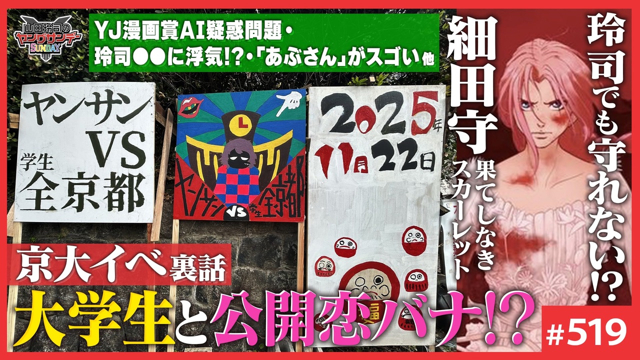 前半:<a href="https://www.nicovideo.jp/watch/so45692364" class="watch">so45692364</a><br>後半:<a href="https://www.nicovideo.jp/watch/so45692367" class="watch">so45692367</a><br><br>12/31(水)締切 第5回ヤンサンオープニングムービー選手権<br><a href="https://yamada-reiji.com/archives/3266" target="_blank" rel="noopener nofollow">https://yamada-reiji.com/archives/3266</a><br><br>【出演】<br>山田玲司 <a href="https://twitter.com/yamadareiji" target="_blank" rel="noopener nofollow">https://twitter.com/yamadareiji</a><br>奥野晴信 <a href="https://twitter.com/nozomuhighkick" target="_blank" rel="noopener nofollow">https://twitter.com/nozomuhighkick</a> <br>清水大輔 <a href="https://twitter.com/TenparistChan43" target="_blank" rel="noopener nofollow">https://twitter.com/TenparistChan43</a> <br><br>視聴・入退会に関するトラブルは、ニコニコヘルプにお問い合わせ下さい。<br><a href="http://qa.nicovideo.jp/" target="_blank" rel="noopener nofollow">http://qa.nicovideo.jp/</a><br><br>2025年12月2日 収録