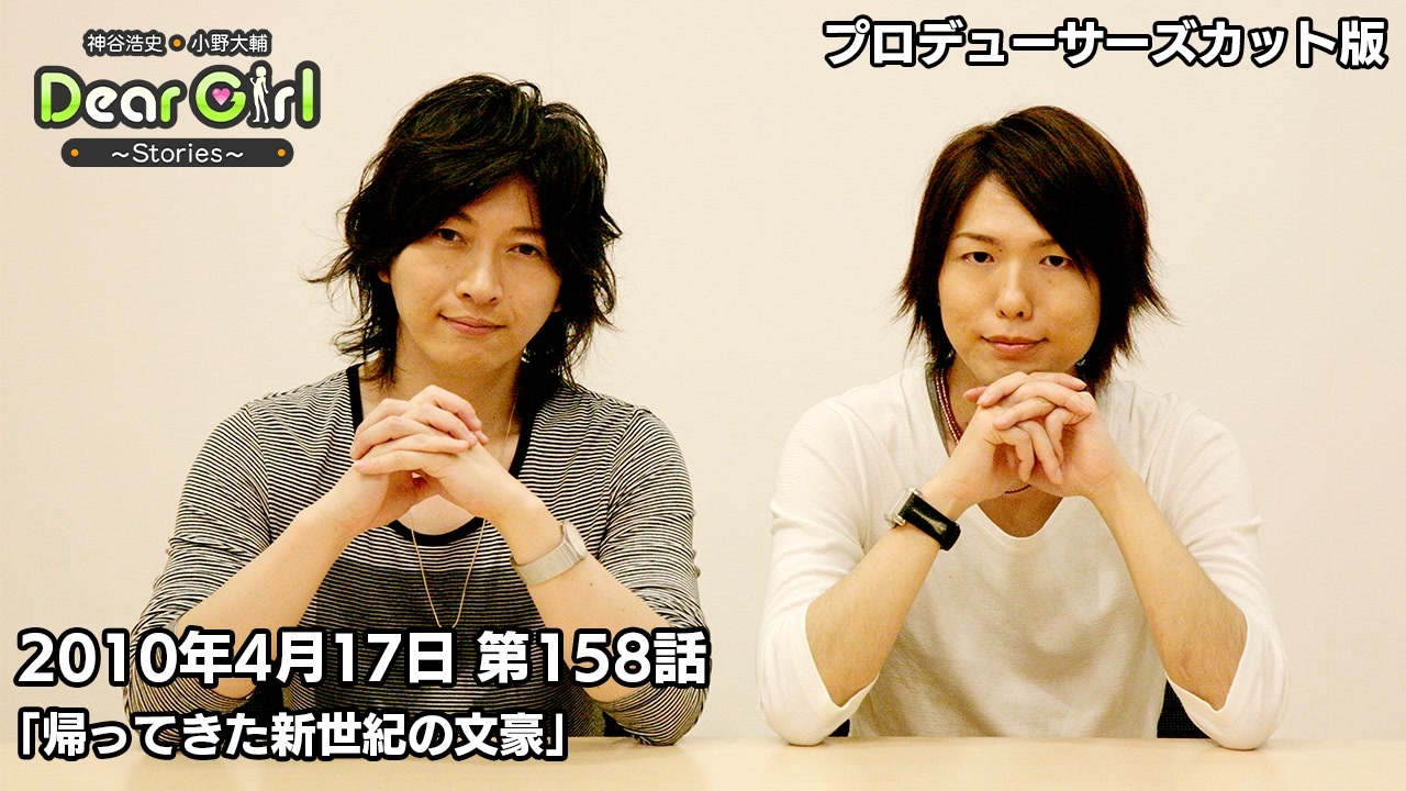 『神谷浩史・小野大輔のDear Girl〜Stories〜』<br>「第158話 帰ってきた新世紀の文豪」(2010年4月17日放送)プロデューサーズカットバージョン<br><br>こちらでは、文化放送で放送中のラジオ番組『神谷浩史・小野大輔のDear Girl〜Stories〜』の<br>過去音源を再編集したものをDGSチャンネル会員向けに配信!<br><br>今回は第158回放送のプロデューサーズカットバージョンをお届けします。<br><br><br>『神谷浩史・小野大輔のDear Girl〜Stories〜』<br><br>文化放送 毎週(土)25時〜25時30分<br>ラジオ大阪 毎週(日)23時〜23時30分<br>インターネットサイマルラジオradikoでも聴取可能です。<br><br>・公式Twitter:<a href="https://twitter.com/uchi_P_" target="_blank" rel="noopener nofollow">https://twitter.com/uchi_P_</a><br>・番組メールアドレス:dgs@joqr.net<br>・番組公式サイト:<a href="https://pc.animelo.jp/special/deargirl-stories/" target="_blank" rel="noopener nofollow">https://pc.animelo.jp/special/deargirl-stories/</a>