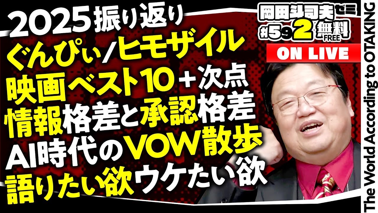 <strong>番組後半</strong>はこちら<br>・限定<span style="font-size: 10px;">(2026年12月31日まで)</span><a href="https://nico.ms/so45777473?from=2437" target="_blank" rel="noopener nofollow">https://nico.ms/so45777473?from=2437</a><br>・プレミアム(無期限)<a href="https://nico.ms/so45777456?from=2437" target="_blank" rel="noopener nofollow">https://nico.ms/so45777456?from=2437</a><br><br>━━━━━━━━━━━━━━━━━━━━━━━<br>東村アキコの漫画『ヒモザイル』は何がアウトだったのか?<br>→ <a href="https://president.jp/articles/-/19093?page=2" target="_blank" rel="noopener nofollow">https://president.jp/articles/-/19093?page=2</a><br>東村アキコ『ヒモザイル』休載に見る“炎上気にしすぎ”時代<br>→ <a href="https://joshi-spa.jp/381892" target="_blank" rel="noopener nofollow">https://joshi-spa.jp/381892</a><br>『ヒモザイル』は炎上したが…女子マンガの世界ではなぜ「養う女・養われる男」が描かれるのか<br>→ <a href="https://news.livedoor.com/article/detail/24695744/" target="_blank" rel="noopener nofollow">https://news.livedoor.com/article/detail/24695744/</a><br><br>━━━━━━━━━━━━━━━━━━━━━━━<br>◆お便り投稿フォーム<br> <a href="https://forms.gle/FqArc9gLPLZp3Vov7" target="_blank" rel="noopener nofollow">https://forms.gle/FqArc9gLPLZp3Vov7</a><br>◆<a href="https://otaking.stores.jp/" target="_blank">岡田斗司夫ゼミ通販部</a><br>・視聴トラブル・入退会については、<a href="https://qa.nicovideo.jp/?site_domain=default" target="_blank">ニコニコヘルプ</a>にお問い合わせ下さい。<br><br>2025年12月28日 放送