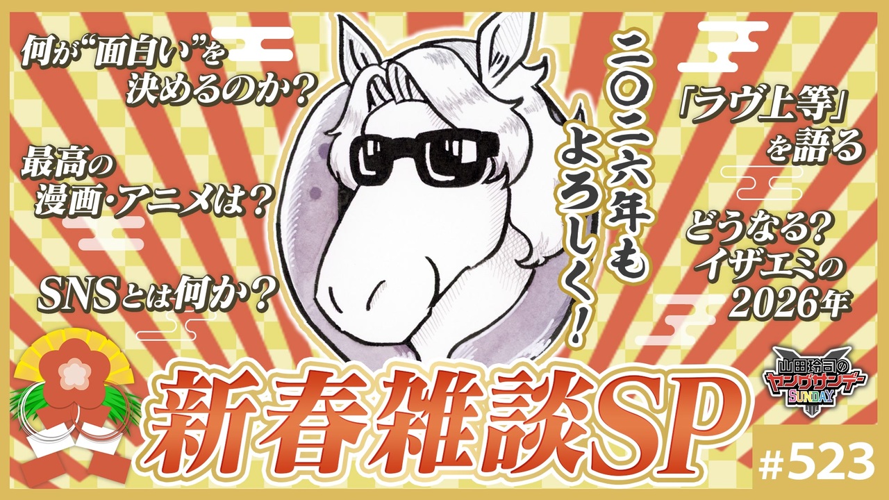 前半:<a href="https://www.nicovideo.jp/watch/so45804986" class="watch">so45804986</a><br>後半:<a href="https://www.nicovideo.jp/watch/so45805007" class="watch">so45805007</a><br><br>【出演】<br>山田玲司 <a href="https://twitter.com/yamadareiji" target="_blank" rel="noopener nofollow">https://twitter.com/yamadareiji</a><br>奥野晴信 <a href="https://twitter.com/nozomuhighkick" target="_blank" rel="noopener nofollow">https://twitter.com/nozomuhighkick</a> <br>清水大輔 <a href="https://twitter.com/TenparistChan43" target="_blank" rel="noopener nofollow">https://twitter.com/TenparistChan43</a> <br><br>【ゲスト】 <br>伊澤恵美子 <a href="https://x.com/emikoizawa" target="_blank" rel="noopener nofollow">https://x.com/emikoizawa</a><br>だろめおん <a href="https://x.com/daromeon" target="_blank" rel="noopener nofollow">https://x.com/daromeon</a><br><br>視聴・入退会に関するトラブルは、ニコニコヘルプにお問い合わせ下さい。<br><a href="http://qa.nicovideo.jp/" target="_blank" rel="noopener nofollow">http://qa.nicovideo.jp/</a><br><br>2026年1月1日 収録