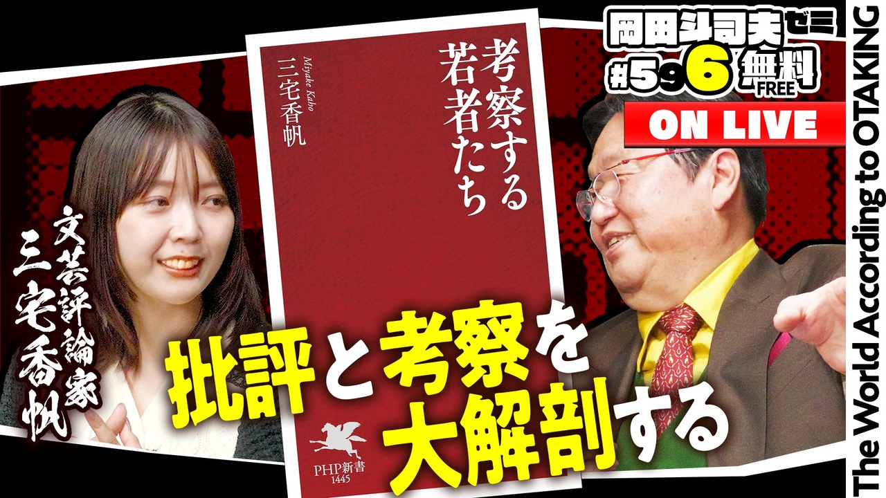 <a href="#" class="seekTime" data-seekTime="31:58" onclick="seekNicoPlayer('#31:58'); return false;">#31:58</a> 限定<br><br><strong>プレミアム</strong>はこちら<br><a href="https://nico.ms/so45926089?from=3775" target="_blank" rel="noopener nofollow">https://nico.ms/so45926089?from=3775</a><br><br>━━━━━━━━━━━━━━━━━━━━━━━<br>考察する若者たち<br>→ <a href="https://amzn.to/4rct8EQ" target="_blank" rel="noopener nofollow">https://amzn.to/4rct8EQ</a><br>X:三宅香帆<br>→ <a href="https://x.com/m3_myk" target="_blank" rel="noopener nofollow">https://x.com/m3_myk</a><br>Youtube:三宅書店【本を読むモチベを上げるチャンネル】<br>→ <a href="https://www.youtube.com/@KahoMiyake" target="_blank" rel="noopener nofollow">https://www.youtube.com/@KahoMiyake</a><br><br>━━━━━━━━━━━━━━━━━━━━━━━<br>◆お便り投稿フォーム<br> <a href="https://forms.gle/FqArc9gLPLZp3Vov7" target="_blank" rel="noopener nofollow">https://forms.gle/FqArc9gLPLZp3Vov7</a><br>◆<a href="https://otaking.stores.jp/" target="_blank">岡田斗司夫ゼミ通販部</a><br>・視聴トラブル・入退会については、<a href="https://qa.nicovideo.jp/?site_domain=default" target="_blank">ニコニコヘルプ</a>にお問い合わせ下さい。<br><br>2026/02/08 放送/公開期間:2027年2月28日まで